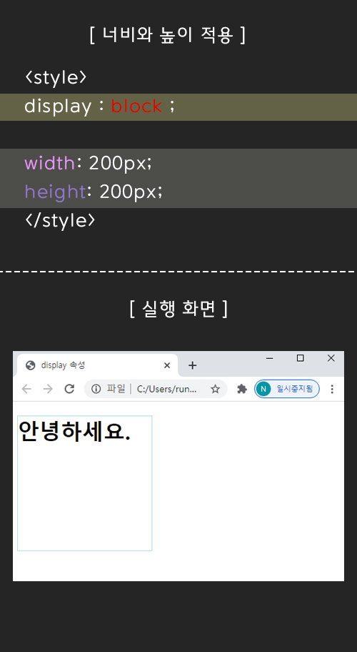 이처럼 display: block;은 폭과 높이를 지정할 수 있다.