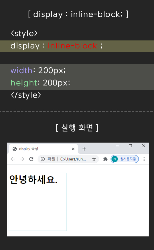 display : inline-block; 은 inline과 block 속성을 결합했다고 생각하면 된다.