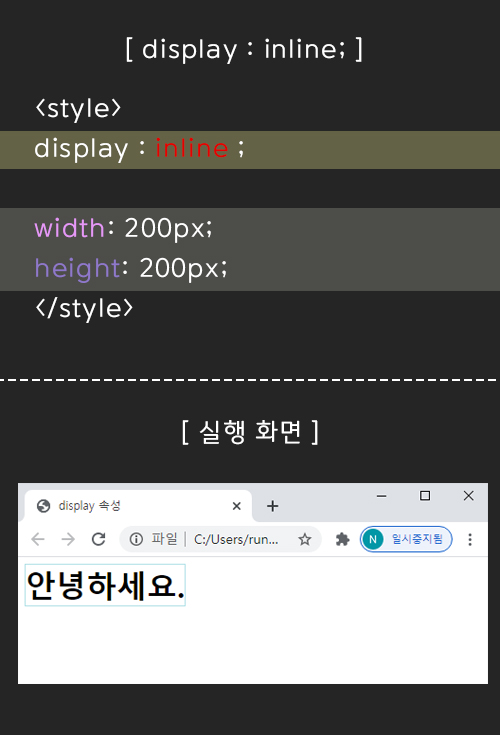 display : inline; 은 폭과 높이를 지정해줘도 적용이 안된다.