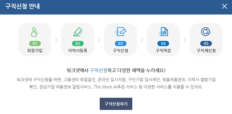 워크넷 홈페이지 : 구직 신청 워크넷(바로가기)에 구직신청을 먼저 해주셔야지 청년취업지원제도에 신청이 가능합니다. 워크넷 홈페이지에 들어가셔서 회원가입 후 이력서와 자기소개서를 등록하시고 구직신청을 완료해주세요. 이력서 등록과 구직신청은 로그인하신 후 마이페이지에 가면 있습니다.