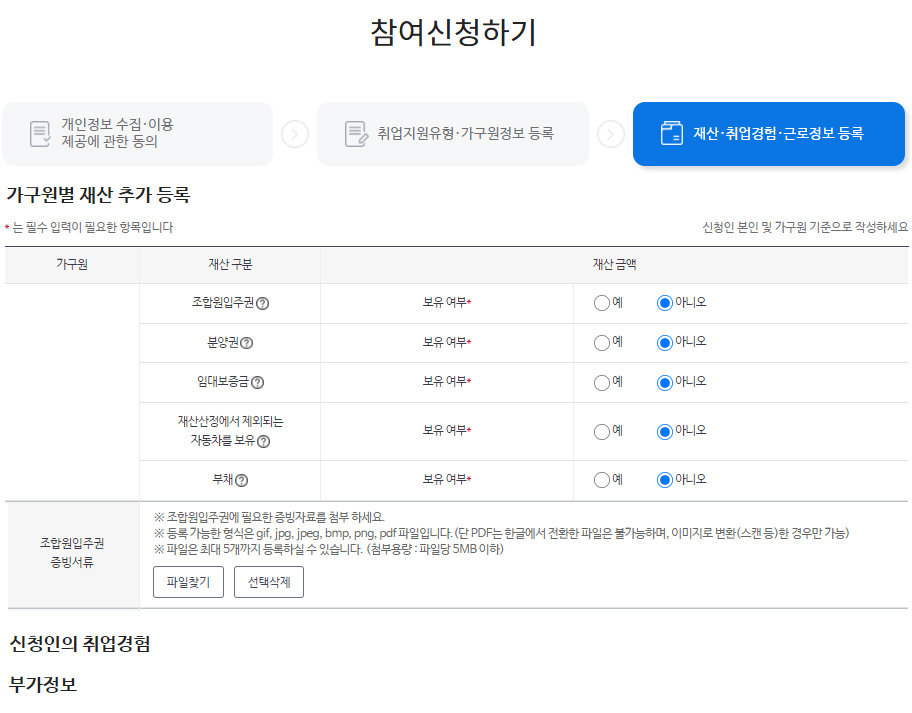 국민 취업지원제도 신청하기 : 재산·취업경험·근로정보 등록 저장 후 다음 단계로 넘어가면 [가구원별 재산 추가 등록]과 [신청인의 취업경험], [부가정보]를 입력하는 란이 나옵니다. 전체 증빙서류까지 첨부하고 나서 [신청하기] 버튼을 눌러주시면 신청이 완료됩니다.