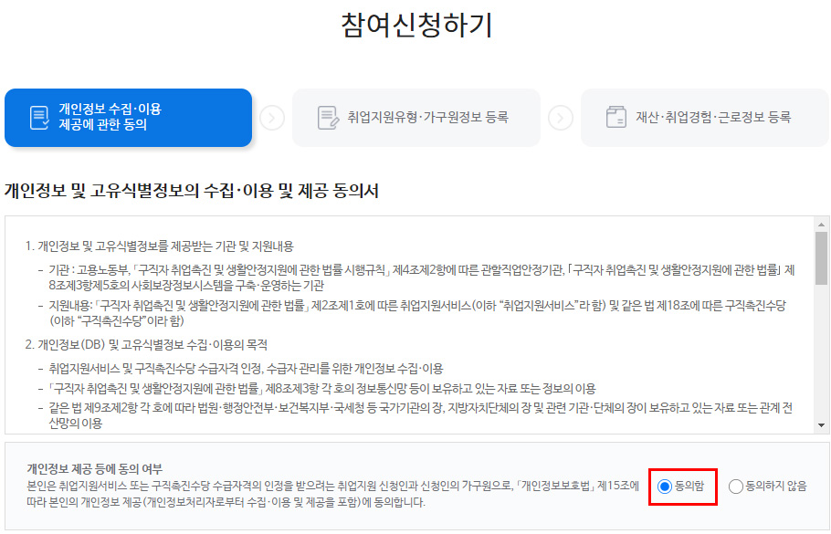 국민 취업지원제도 신청하기 : 개인정보 수집·이용 제공에 관한 동의 [휴대폰 본인인증]을 하면 [참여신청하기] 페이지가 나옵니다. [개인정보 수집·이용 제공에 관한 동의]를 읽어보시고 전체 [동의함] 체크해준 후 [다음 단계]로 넘어갑니다.