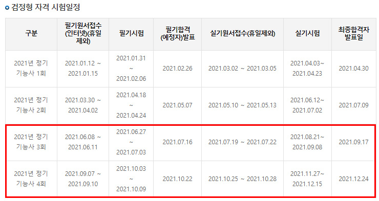 웹디자인 기능사 자격증 시험 일정 시험 일정은 필기는 6월달과 9월이 남아있고 실기는 8월~9월과 11월~12월이 남아있습니다. 정기 시험 3회와 4회만 남아있는 상황입니다. 시험 텀이 길기 때문에 공부할 수 있는 시간은 충분합니다. 다만, 주의할 점은 원서접수가 첫날 10시부터 시작인데 10시 이전에 미리 대기하셨다가 10시 정각이 됐을 때 바로 접수하셔야지 원하는 지역에 접수가 가능합니다.
