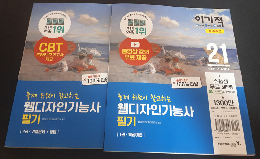 웹디자인 기능사 필기 공부책 ㅣ 이기적 저는 이기적 웹디자인기능사 필기 책으로 공부했어요. 1권 핵심이론과 2권 기출문제로 구성되어 있는데 1권 핵심이론은 안 봤고요, 2권 기출문제만 열심히 풀었습니다. 웹디자인 기능사 필기시험은 컴퓨터 그래픽스 운용기능사 필기시험과 거의 비슷해요. 다른 점이라면 코딩이 추가된 정도라서 필기시험 준비하실 때 웹디자인 기능사 필기와 컴퓨터 그래픽스 운용기능사 필기시험 준비를 같이하시면 좋습니다.